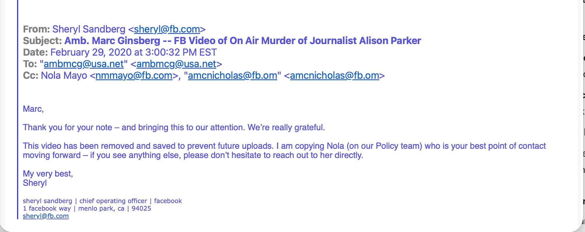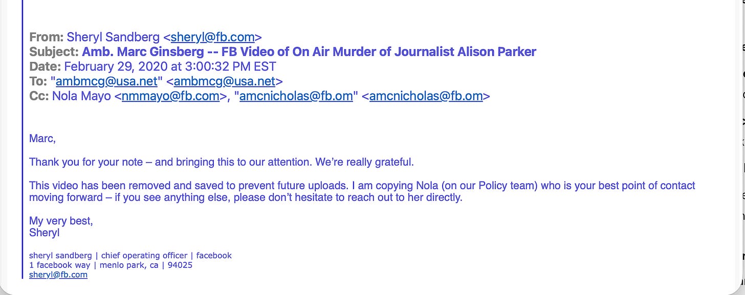 Then there is this act of utter deception. In 2020, Sheryl Sandberg told Ambassador Marc Ginsberg that the video had been “removed and saved to prevent future uploads.”