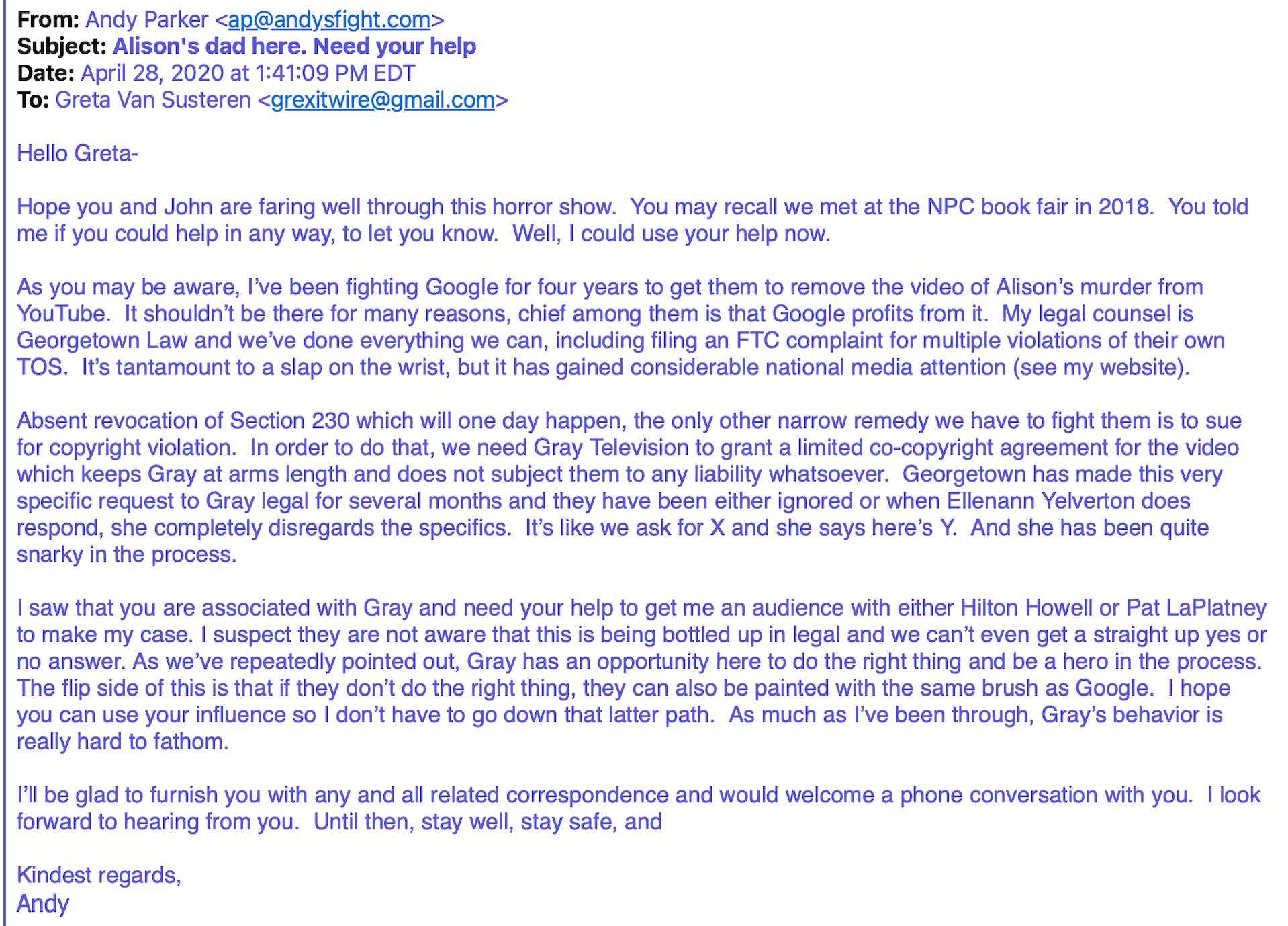 The rot isn’t just in Silicon Valley; it’s in the legacy media companies that enable them. Gray Television owns a key to the lock—the copyright to the footage of Alison’s murder—and they spent years gaslighting me to keep it after I appealed to their sense of goodwill.